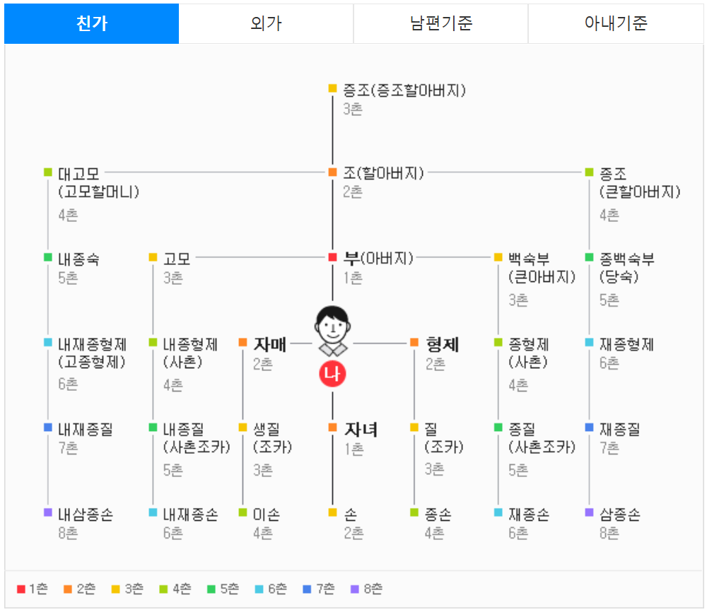- 4촌 : 사촌(같은 증조부모를 둔 관계)