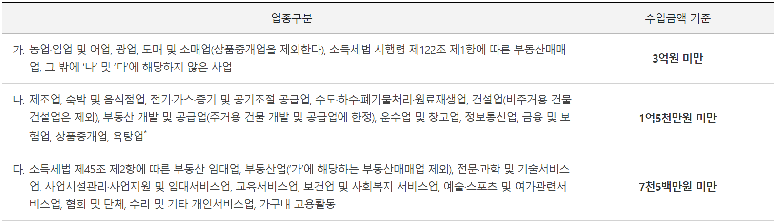 업종별로 수입금액 기준이 달라 살펴보겠습니다. 수입금액 기준 3억원 미만은 농업, 임업, 어업, 광업, 도매 및 소매업(상품중개업제외), 부동산매매업 등에 해당합니다. 수입금액 기준 1억5,000만원 미만은 제조업, 숙박 및 음식점업, 전기 가스 증기 및 공기조절 공급업, 수도 하수 폐기물처리 원료재생업, 건설업, 부동산 개발 및 공급업, 운수업 및 창고업, 정보통신업, 금융 및 보험업, 상품중개업, 욕탕업 등이 해당합니다. 수입금액 기준 7,500만원 미만은 부동산 임대업과 교육서비스업, 보건업 등에 해당합니다.