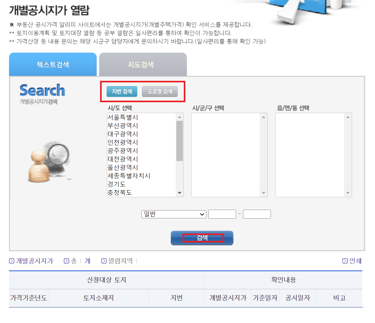 지번 검색/도로명 검색 버튼으로 검색하여 개별공시지가를 열람할 수 있습니다. 실제적인 공시지가와는 일치하지 않을 수 있으므로 참고용으로 확인하세요.