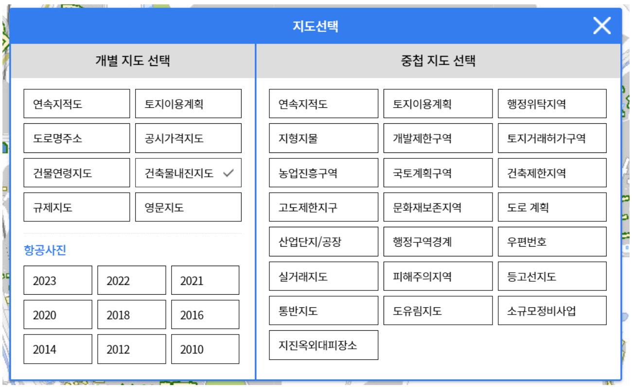 항공지적도, 도시재생사업, 토지거래허가구역, 도로 및 철도정보, 택지개발정보, 산업단지나 공장 정보, 행정위탁지역, 토지이용계획에 따른 지도 등을 jpg나 png 이미지 파일로 저장할 수 있습니다.