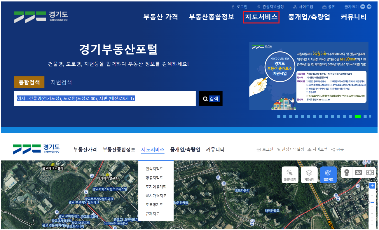 경기부동산포털 접속한 화면에서 지도서비스 메뉴를 클릭합니다.