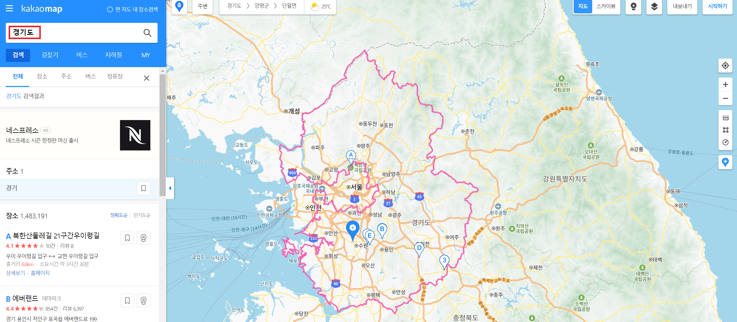 카카오맵에 접속하여 경기도라고 검색합니다. 경기도 지역만 분홍색선이 표시되는데요.