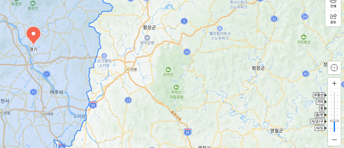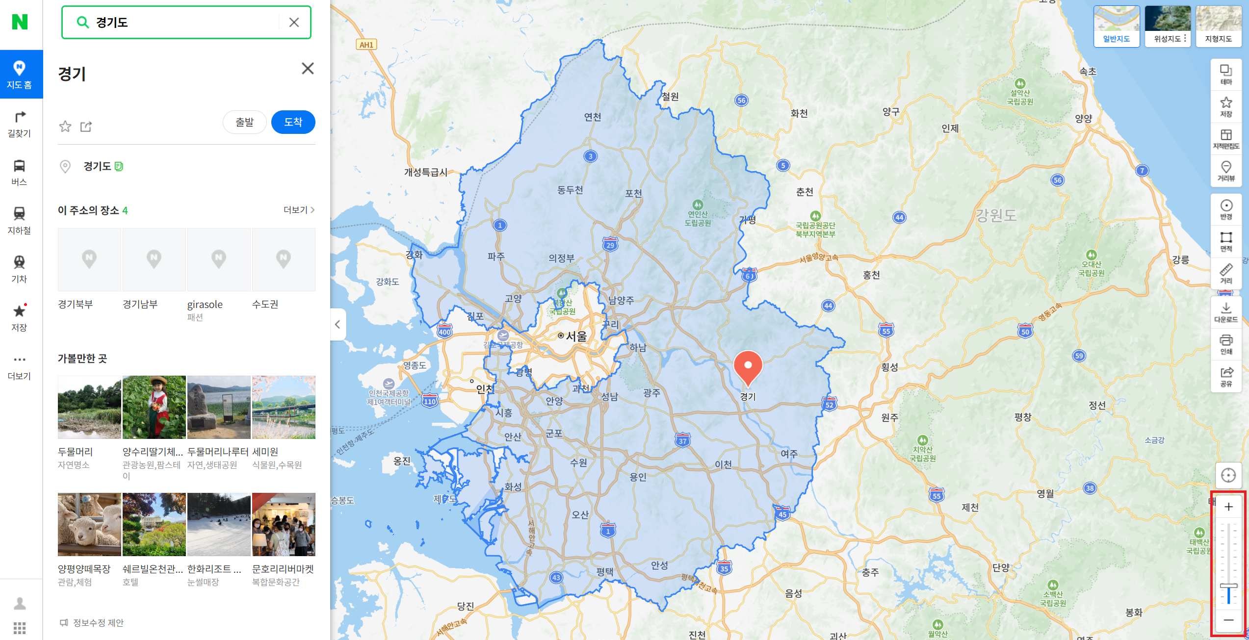오른쪽 아래쪽에서 지도 확대나 축소를 하여 크게 경기도 지도를 확인할 수 있습니다.