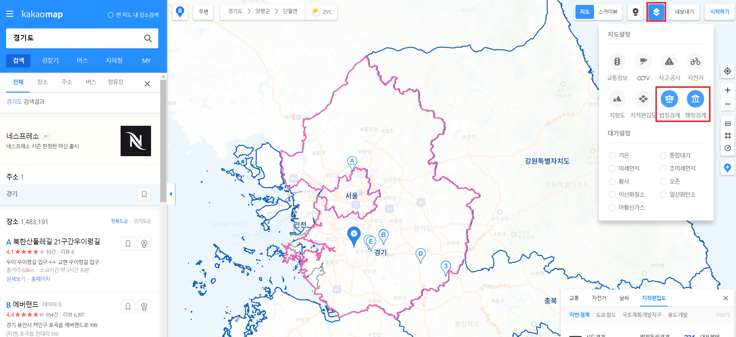 상단 오른쪽에 레이어를 클릭후 법정경계, 행정경계를 눌러 더 자세하게 경기도 지역 경계선을 알 수 있습니다.