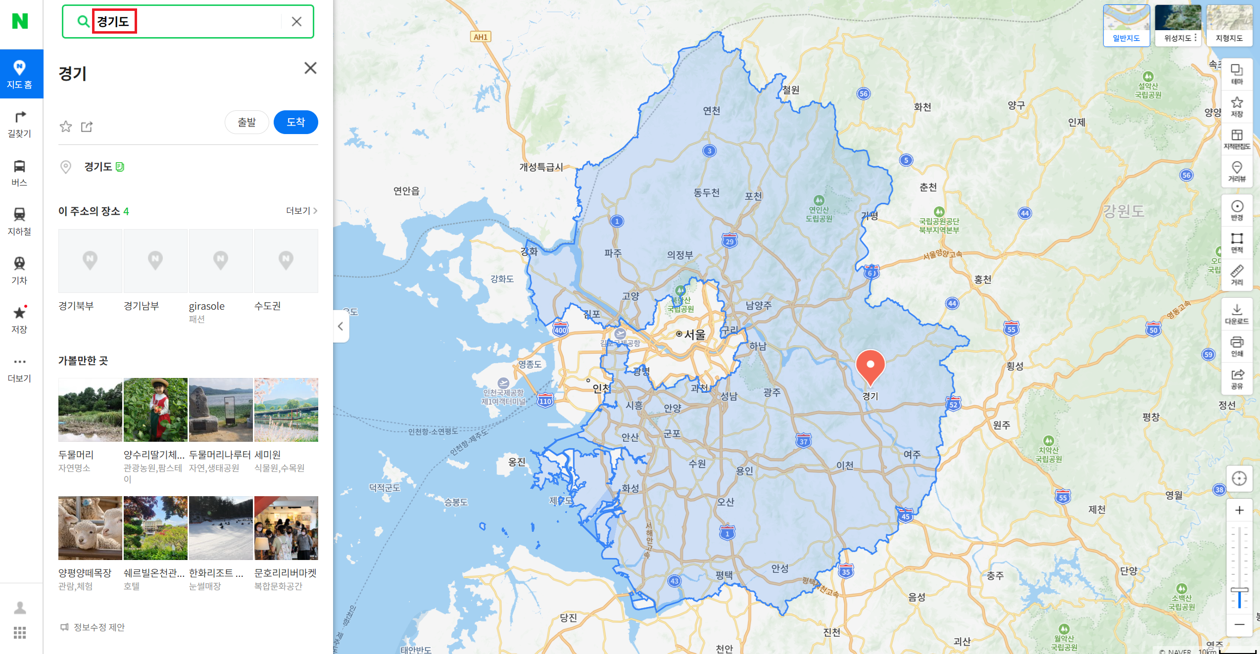 네이버지도에 경기도를 검색합니다. 경기도 지역만 파란색으로 지도에 표시되는데요.