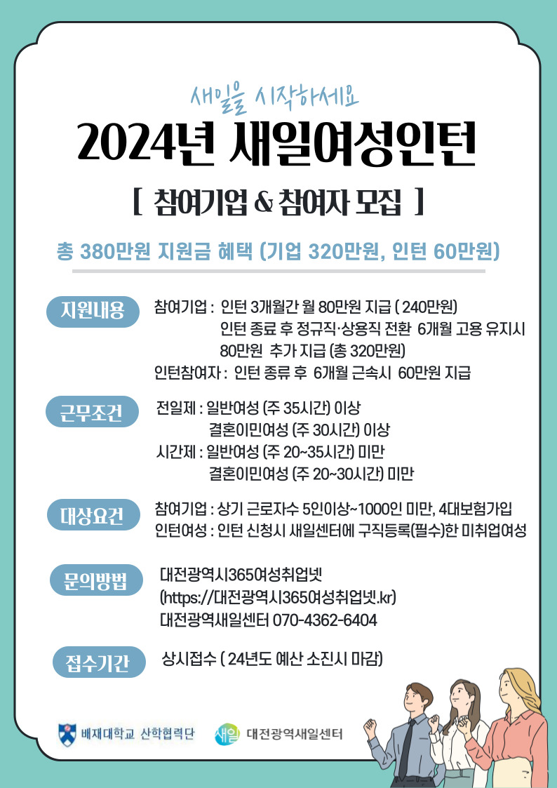 참여대상자는 새일센터에 구직 등록된 미취업 여성이면 지원할 수 있습니다. 참여를 희망하는 여성과 기업은 대전광역시365여성취업넷.kr 온라인 사이트 또는 전화(070-4362-6404)로 문의하면 됩니다. 접수기간은 상시접수이나 24년도 예산 소진시 마감된다고 합니다.