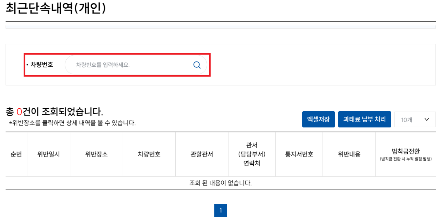 최근단속내역을 보시면 위반일시, 장소, 차량번호. 관할관서, 관서 연락처 등이 조회됩니다. 여기서 '과태료 납부 처리' 파란버튼을 누르면 미납과태료 내용을 확인 및 고지서 출력이 가능합니다.