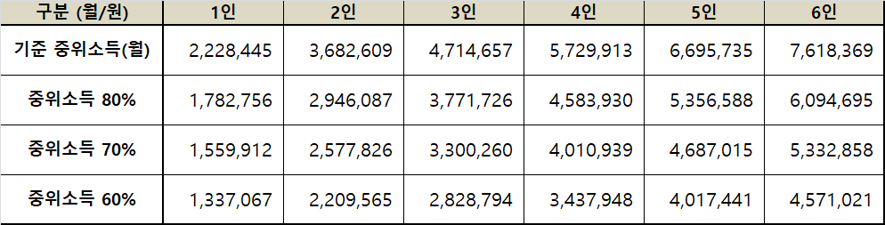 기준 중위소득은 모집공고 요강에 따라 다를 수 있으니 위의 표를 보고 해당여부를 확인합니다.
