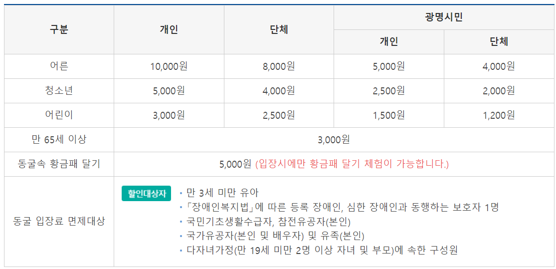 광명동굴 입장료는 어른 개인 10,000원(만 65세이상 3,000원), 청소년은 5,000원, 어린이는 3,000원입니다. 동굴 입장료 면제대상은 만 3세 미만의 유아, 장애인, 국민기초생활수급자와 참전유공자, 국가유공자, 다자녀가정이 해당됩니다. 광명시민 및 할인대상자는 사진이 포함되어 있는 신분증 등 증빙서류를 제시해야 합니다.