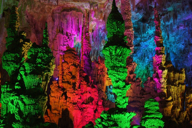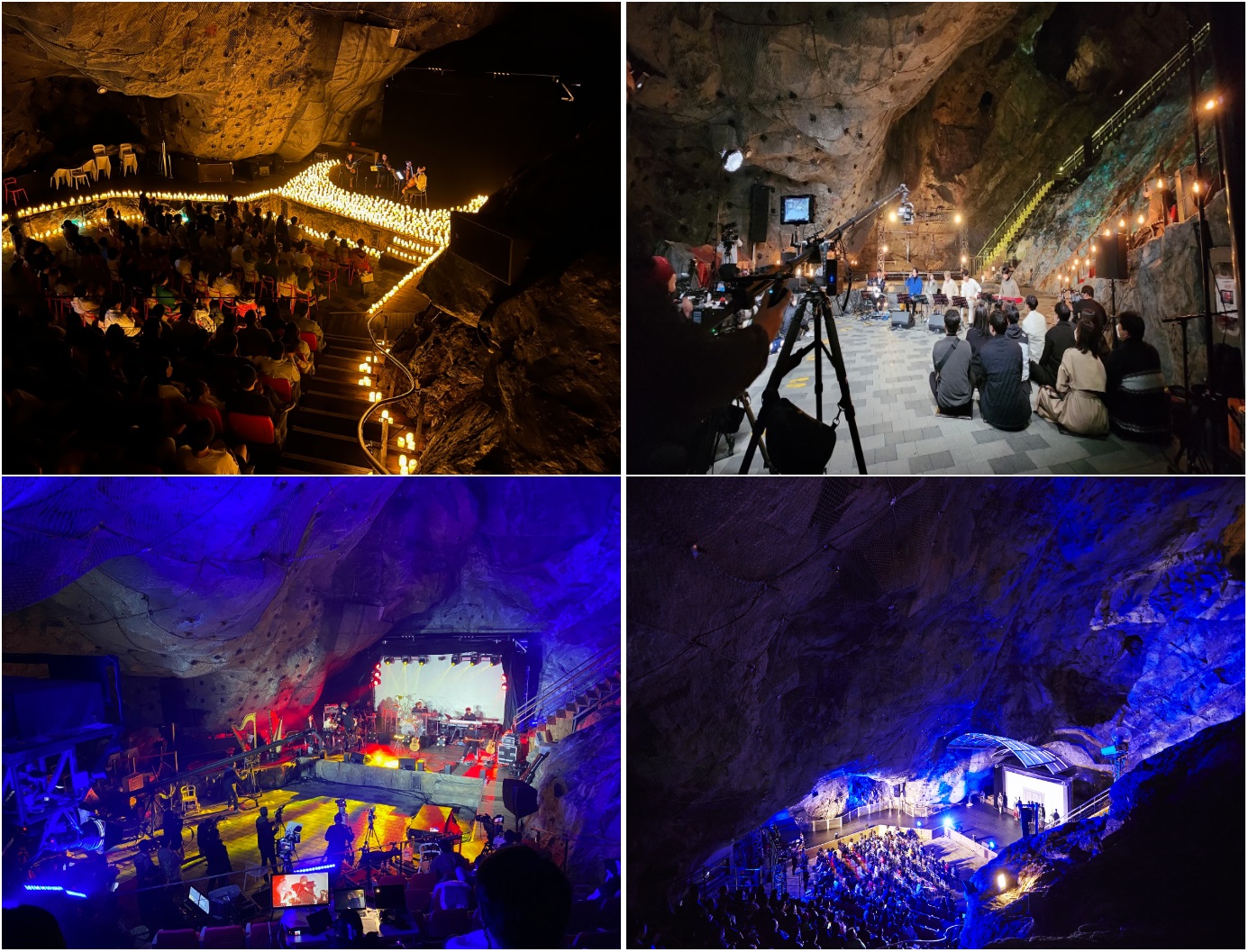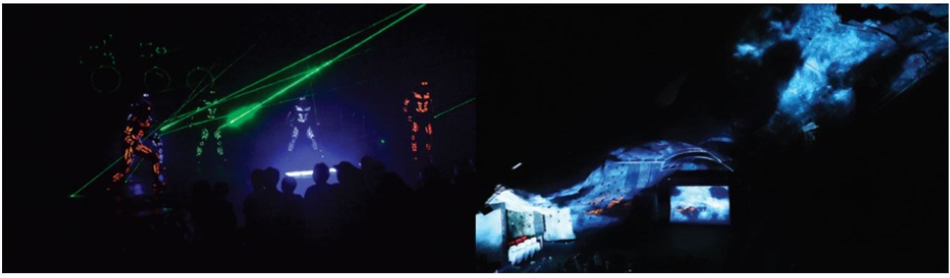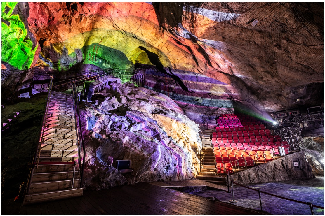 광명동굴 안으로 들어가자마자 색이 다채로운 웜홀광장과 함께 LED조명과 뉴미디어 기법을 이용한 빛전시가 보입니다. 350석 규모의 예술의전당에서 다양한 장르의 공연이 펼쳐 집니다.