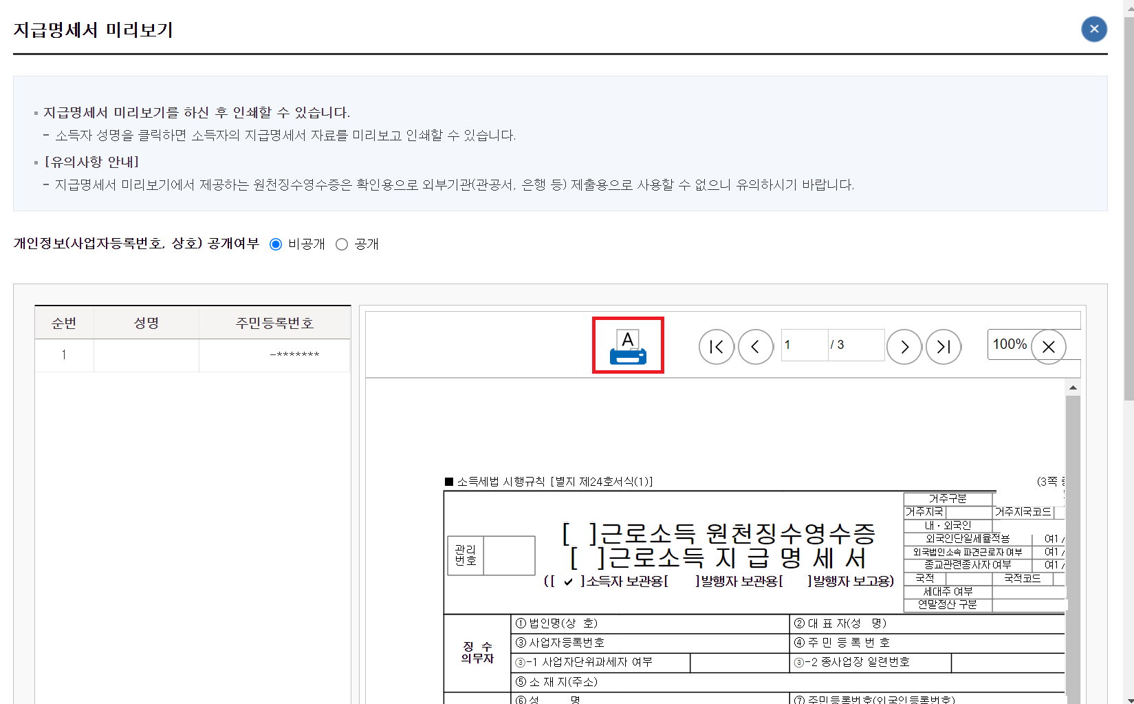 원하시는 원천징수영수증을 선택하여 PDF저장 후 프린트하면 됩니다. 좌측에 프린트모양 A를 클릭하고 인쇄방식 PDF로 지정하고 '인쇄'버튼을 클릭하면 됩니다. 이때 인쇄가 가능하다면 프린트주소를 넣고 인쇄하면 되고, 프린트기가 없다면 PDF로 저장하고 저장버튼을 클릭하면 됩니다.