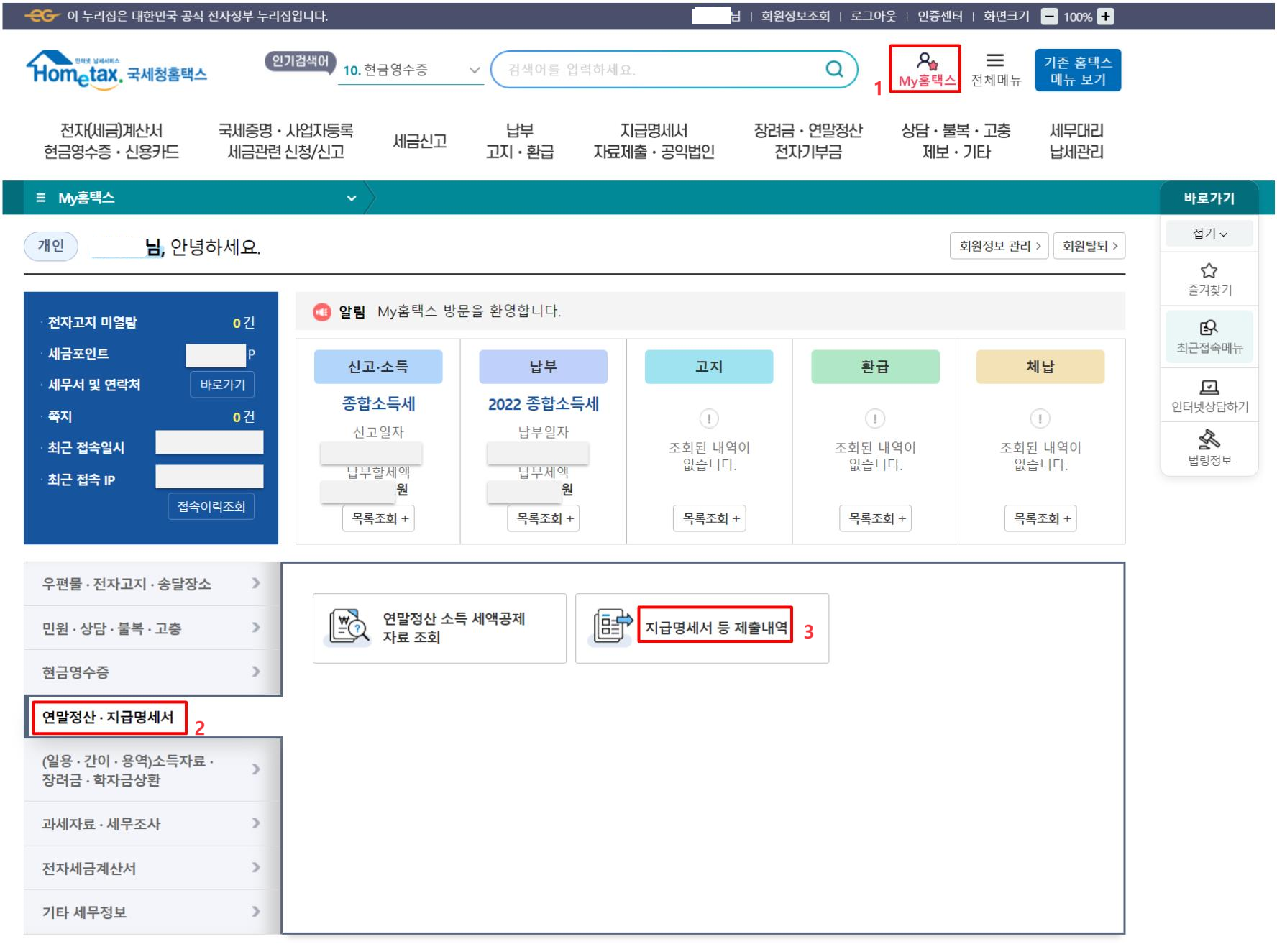 ①My홈택스 >> ②연말정산·지급명세서 >> ③지급명세서 등 제출내역 클릭
