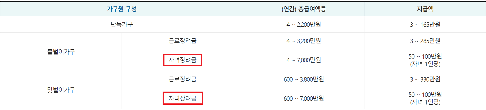 아이를 키우지만 자녀양육비가 부족한 가구에 보조급을 지급하는 것을 자녀장려금이라 합니다. 자녀장려금을 받기 위해서는 총소득(부부합산) 7,000만원 미만이어야 합니다.