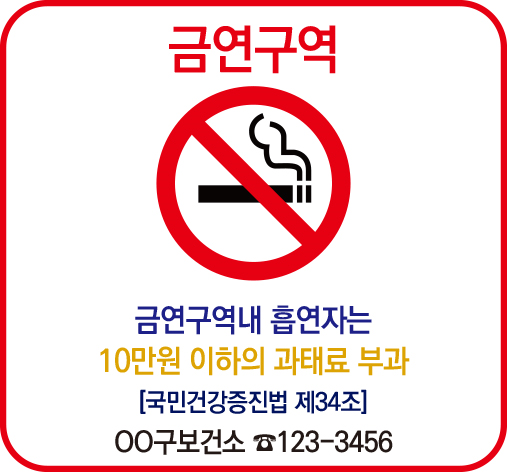 금연을 상징하는 그림 또는 문자, 위반시 조치사항에 대한 내용을 반드시 포함해야 합니다. 금연표지는 한글로 표기하고 필요에 따라 외국어를 병행 표시할 수 있습니다.