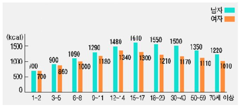 기초대사량은 성장기 15~17세에 가장 높고 나이가 들면서 그래프와 같이 줄어듭니다. 신진대사가 느려지고 근육량이 줄어들기 때문입니다.