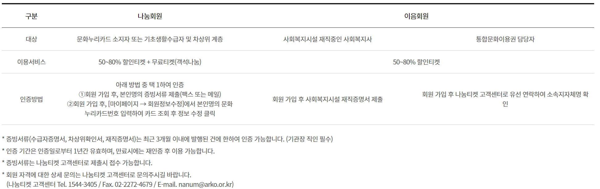 - 나눔회원 : 문화누리카드 소지자 또는 기초생활수급자, 차상위계층