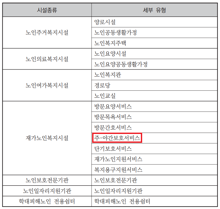 주야간보호서비스는 재가노인복지시설에 해당합니다. 자력으로 다니실 수 있는 어르신이나 가벼운 치매 증상이 있는 분들이 이용할 수 있는 시설입니다.