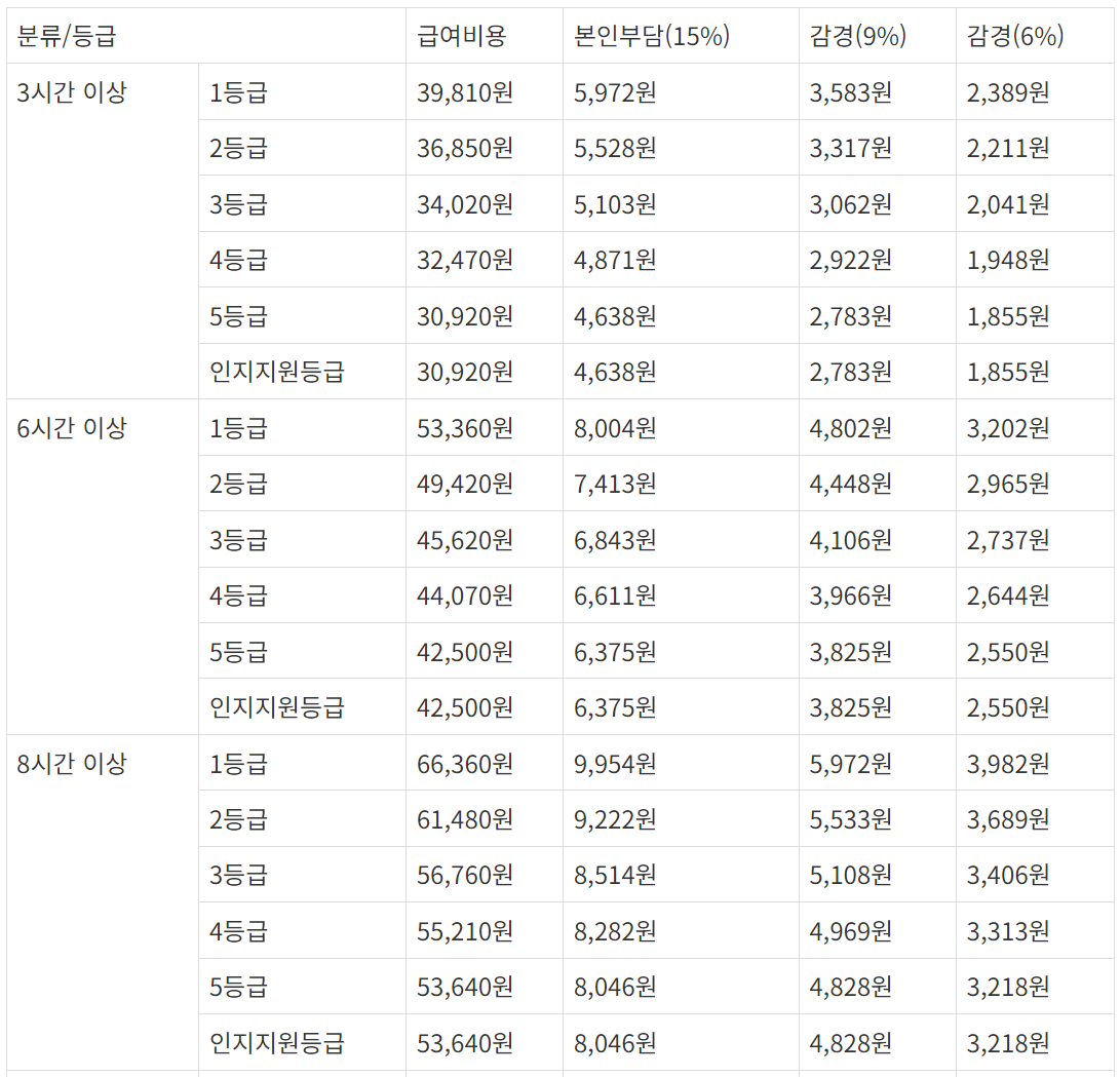 ● 비용 : 장기요양급여 수급자의 등급에 따라 달리 적용됩니다. 아래 사이트를 통해 이용요금을 확인할 수 있습니다.