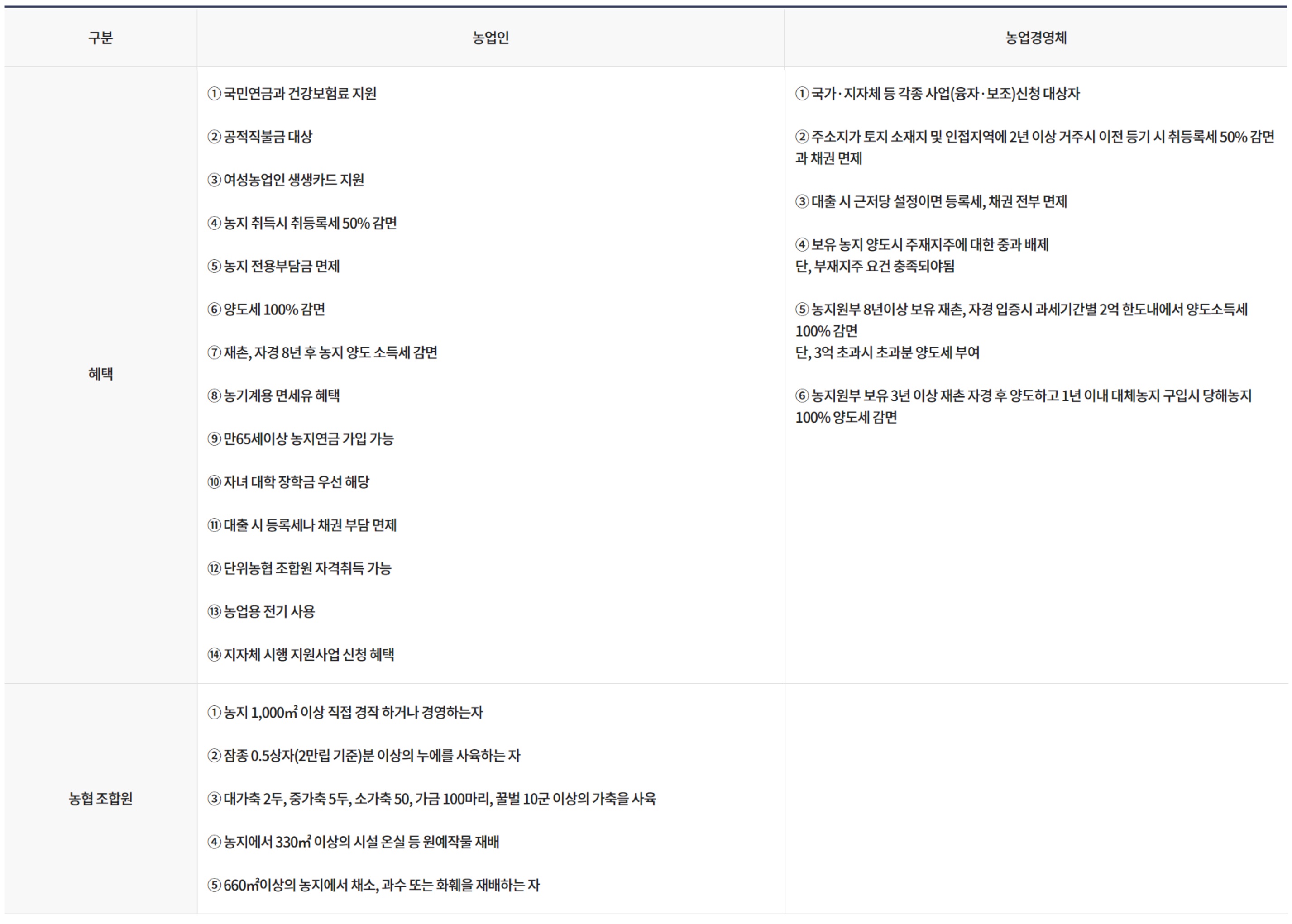 유기질 비료 지원금, 농업경영체는 농기계용 면세유 구입 가능, 쌀 소득 보전금, 경양 이양 보조금, 유기질 비료 지원금, 각종 농업직불금 신청, 농지 양도소득세 감면, 의료보 험료 감면, 농협 조합원 자격 부여 및 유지, 농업회사 법인은 법인세 감면, 배당소득세 면제/영농조합법인은 법인세, 배당소득세 면제 등의 지원이 있습니다.