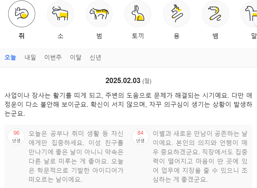 다음 사이트에서 제공하는 무료운세 보기는 자신의 띠 또는 생년월일을 입력하면 운세를 알려줍니다. 하루에 한번씩 자신의 운세를 확인하고 싶은 분들이라면 쉽고 간편하게 이용해보세요.