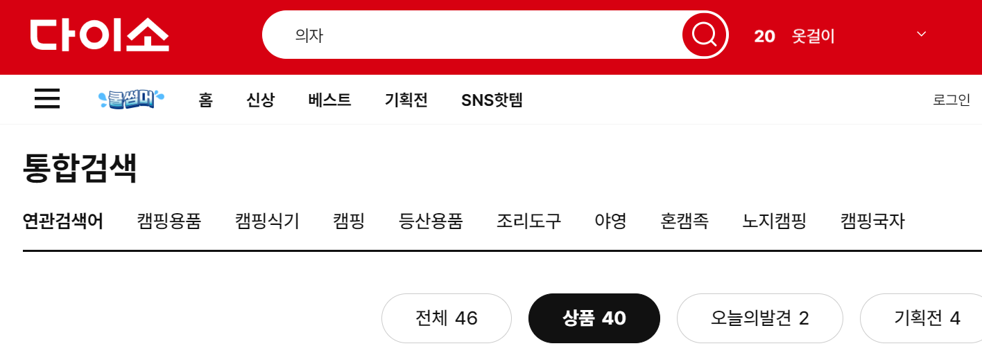 다이소에서 구매했던 캠핑용의자가 추가로 필요해서 재고가 있는지 조회해보겠습니다. 제품명과 번호를 모르는 상태입니다. 다이소 검색란에 의자를 입력해서 들어갑니다.