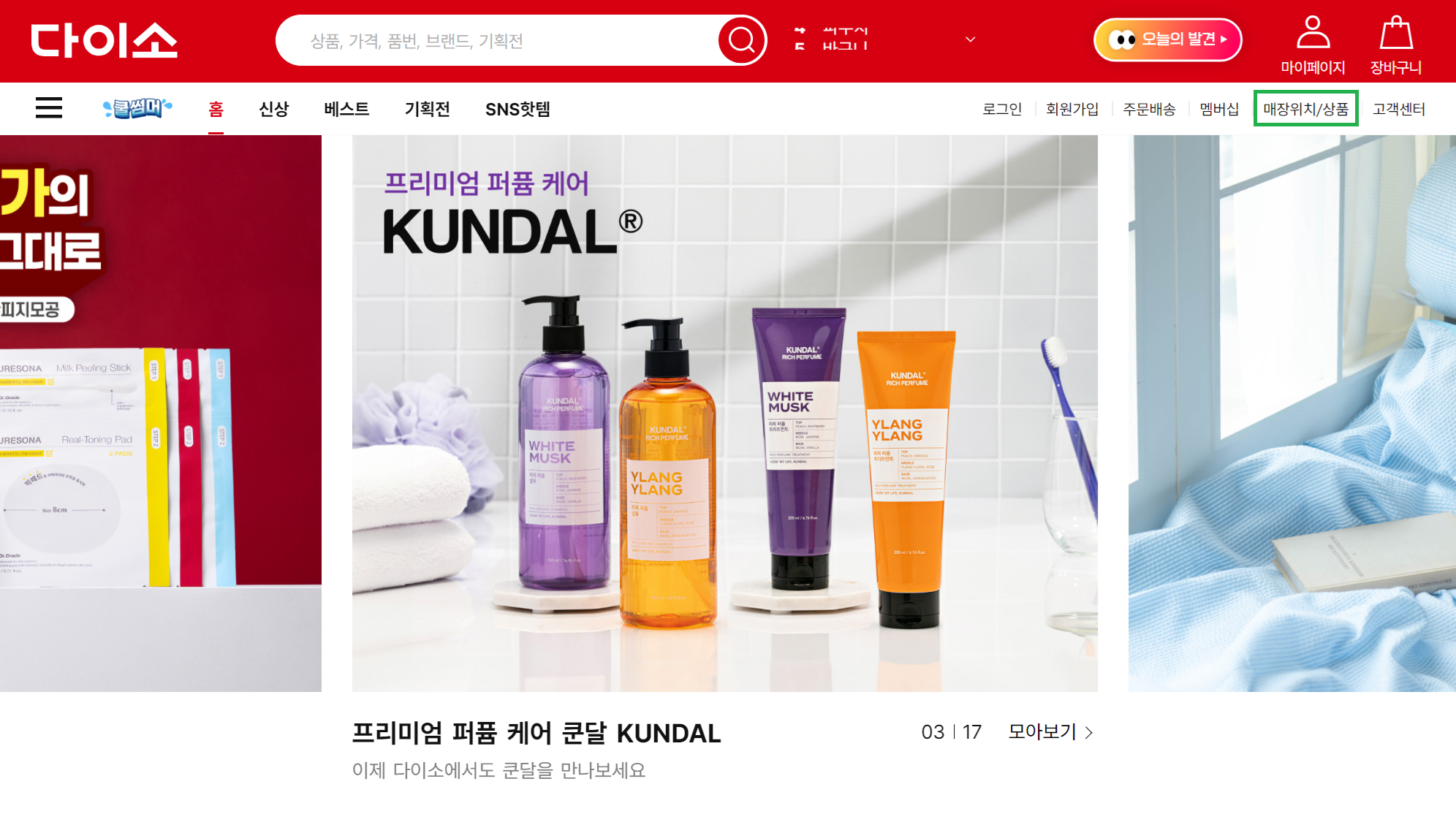 2. 메뉴 오른쪽부분에 '매장위치/상품'을 클릭합니다.