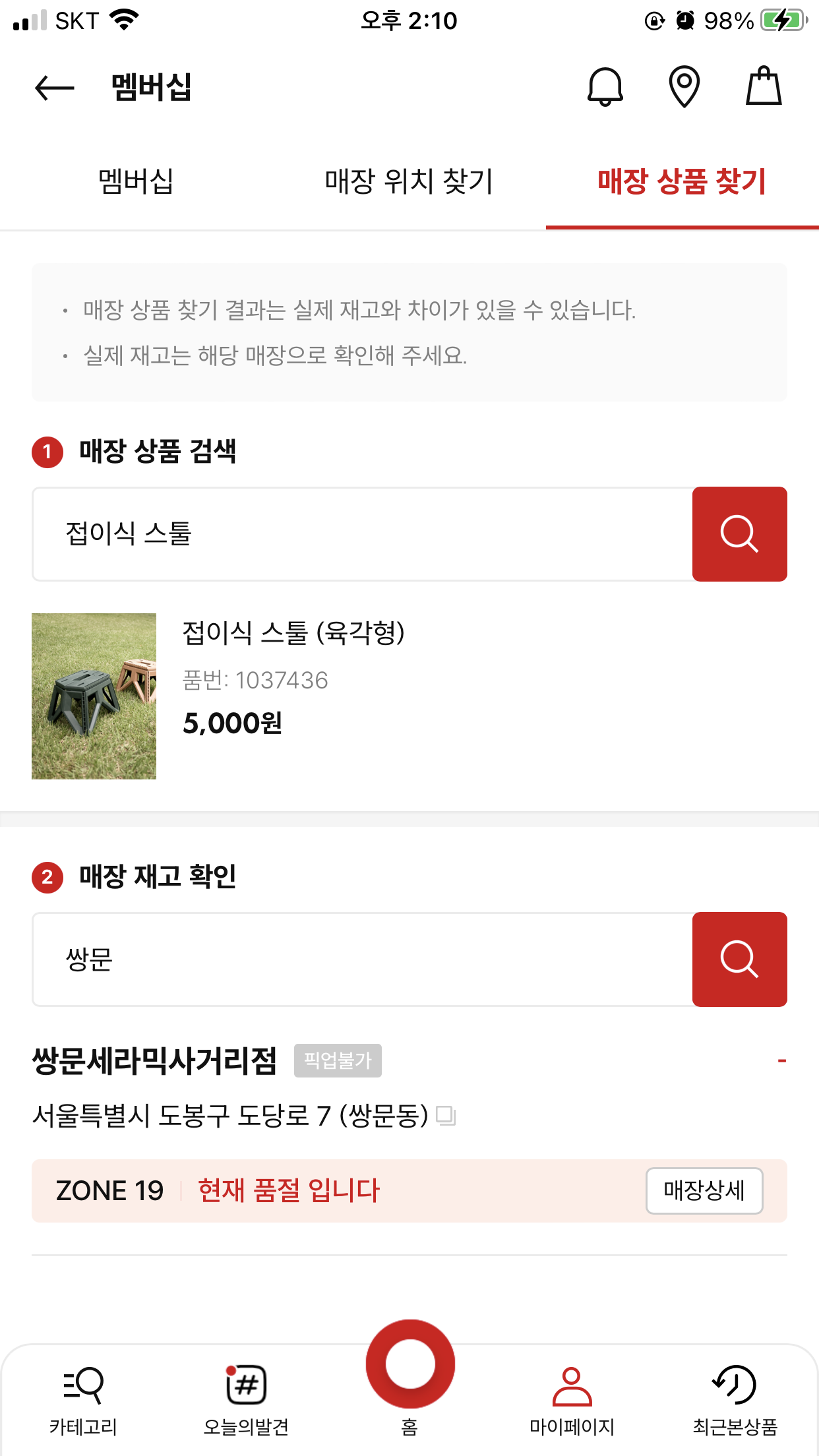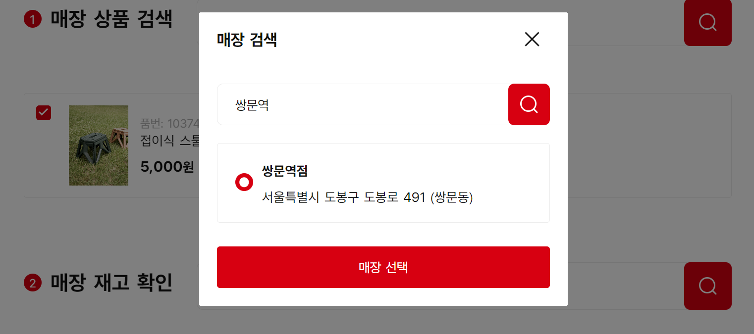 매장 재고 확인 검색란에 '쌍문역'을 검색하여 재고가 있는지 확인합니다.