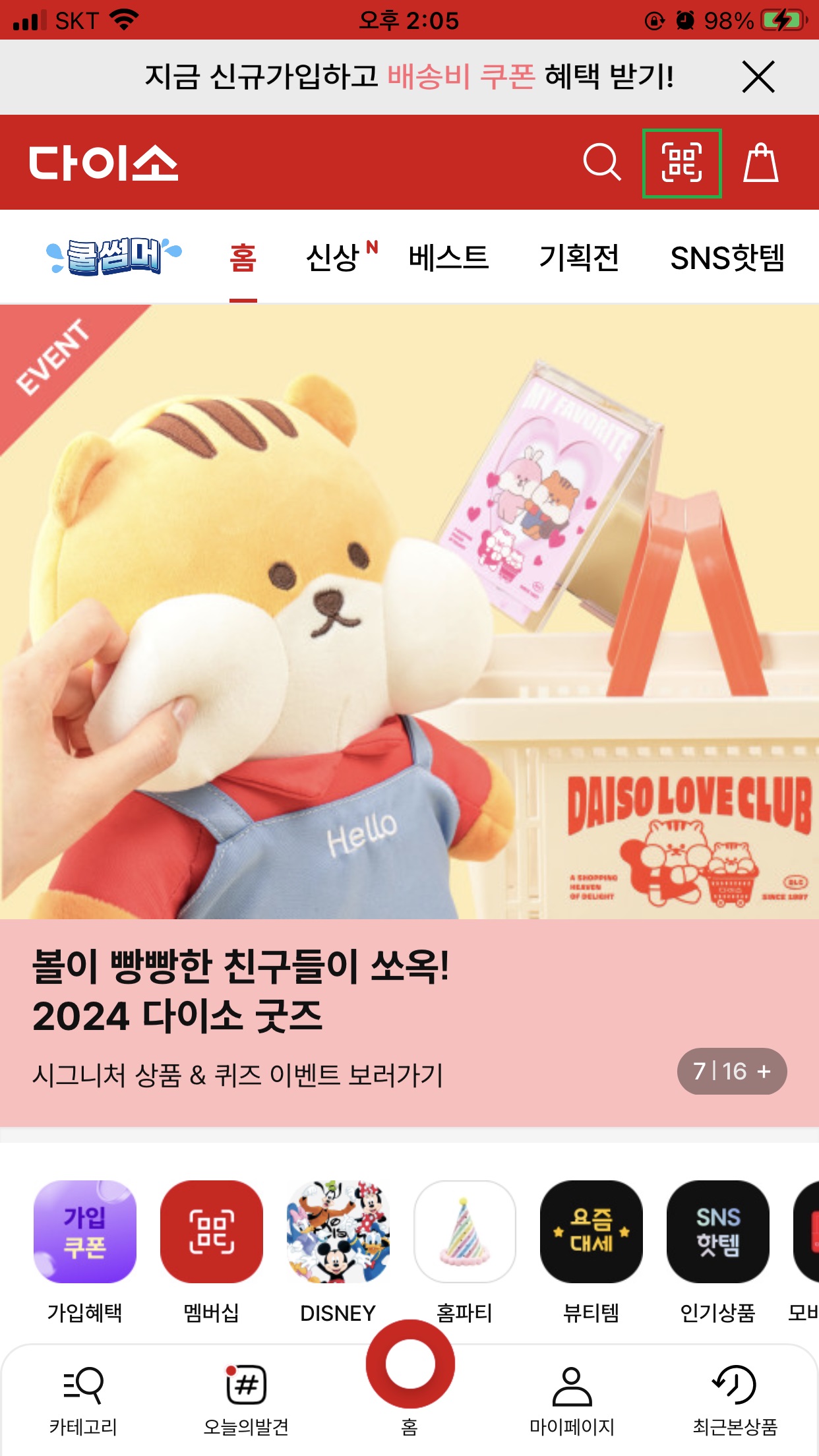 1. 홈 화면 상단에 QR코드 아이콘을 클릭합니다.