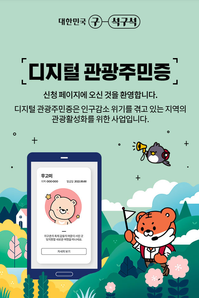 인구감소 위기를 겪고 있는 지역의 관광활성화를 위한 사업입니다. 한국관광공사에서 운영하는 대한민국 구석구석 홈페이지를 통해 디지털 관광주민증을 발급받아 다양한 관광여행 혜택을 받을 수 있습니다.