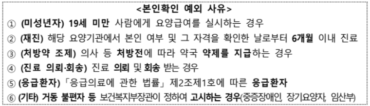 본인확인 예외 사유는 미성년자, 재진, 처방약 조제, 진료 의뢰 및 회송, 응급환자의 경우, 거동 불편자 등이 있습니다.