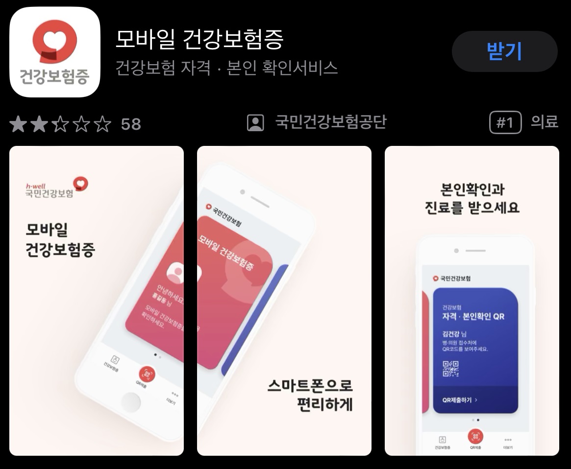 구글스토어나 아이폰앱스토어에 모바일 건강보험증을 검색하면 받기를 누릅니다.