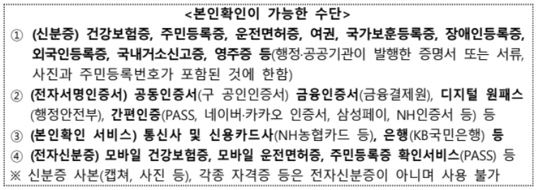 본인확인이 가능한 수단으로는 주민등록증, 외국인등록증 또는 전자서명, 모바일 건강보험증 앱 또는 큐알코드를 제시하는 경우가 가능합니다. 신분증을 캡쳐하거나 사진을 찍은 사본 등과 각종 자격증 등은 전자신분증이 아니며 사용이 불가합니다.