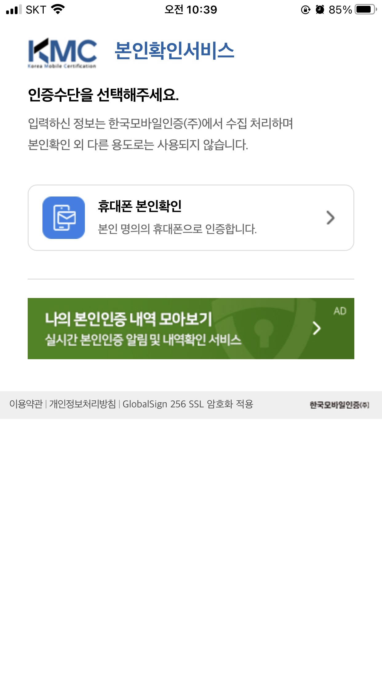 2. 설치 후 본인인증 수단 선택하여 인증합니다.