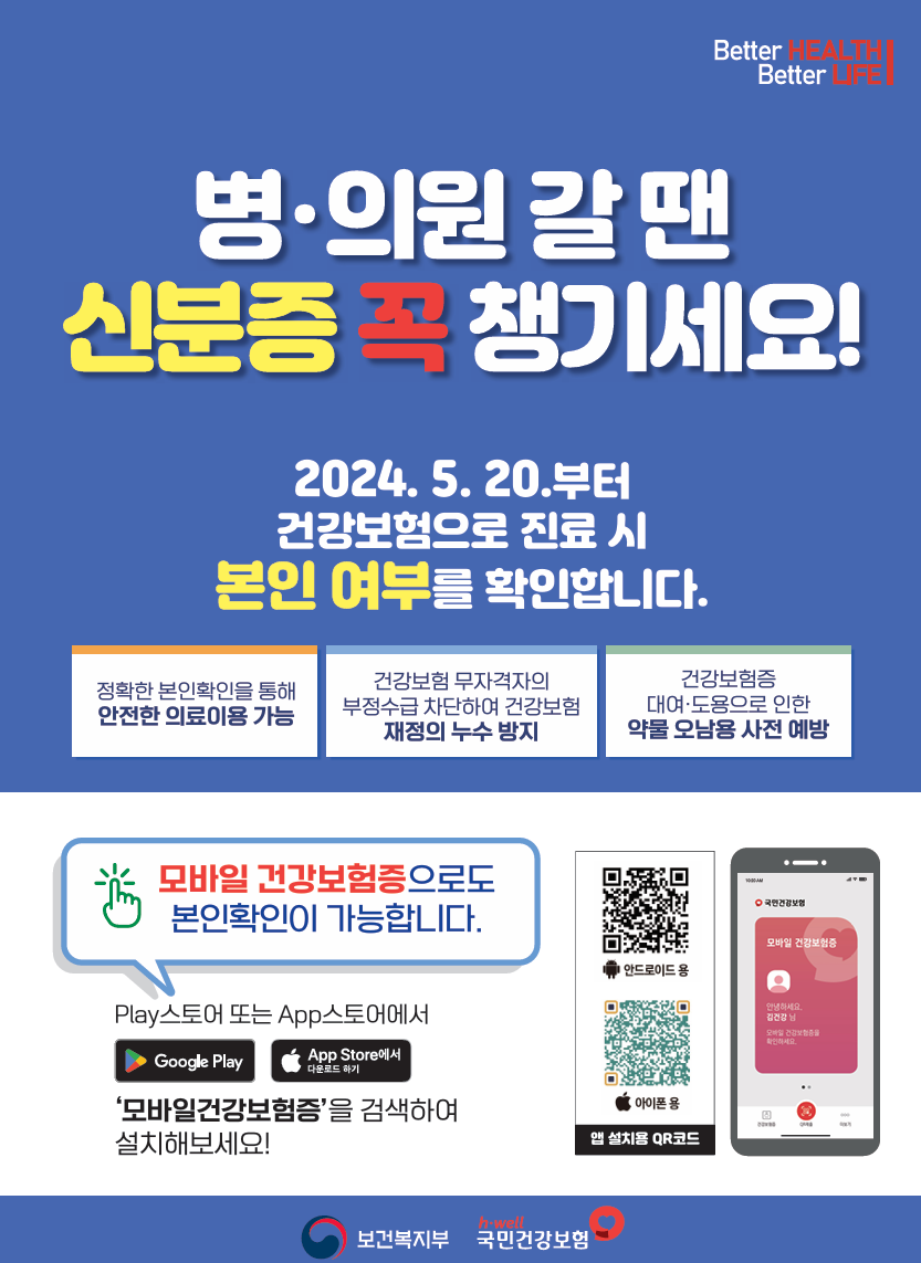 보건복지부는 지난 5월 20일부터 건강보 험 본인확인 의무화 제도를 시행했습니다. 병원, 의원에서 진료를 받을 때에는 꼭 신분증으로 본인확인을 해야 건강 보 험 급여를 적용받을 수 있습니다. 건강 보 험 무자격자가 타인의 명의를 도용하는 악용사례가 많아 그것을 방지하고자 본인확인을 의무화하게 되었습니다.