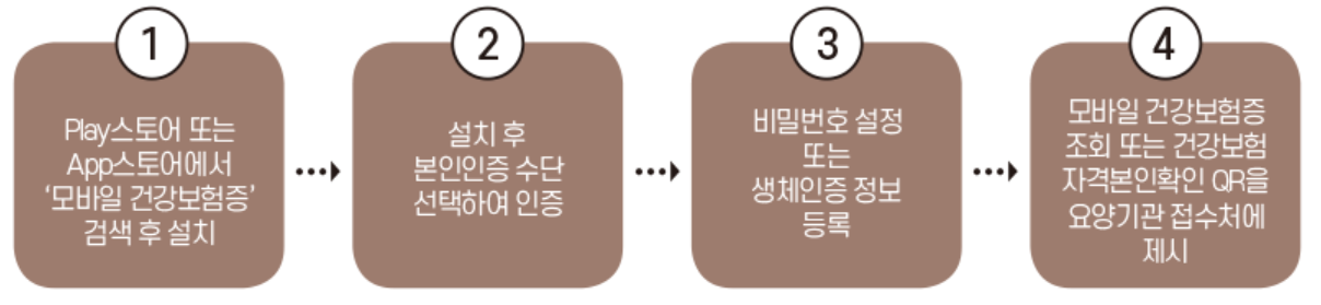 1. Play스토어 또는 App스토어에서 '모바일 건강보험증' 검색 후 설치합니다.