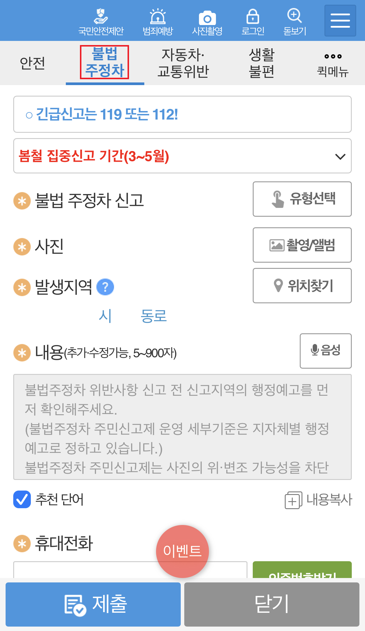 안전신문고 앱 접속한 후에 불법주정차 탭을 클릭해서 제출하면 됩니다.