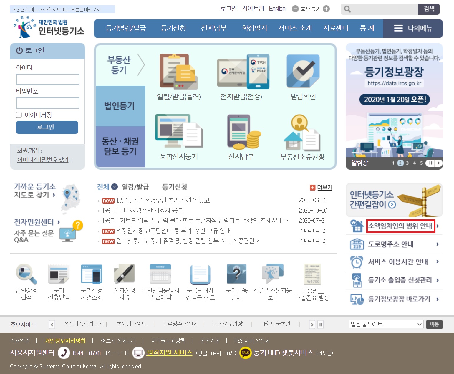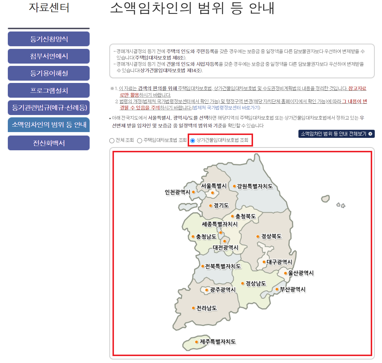 대한민국 법원 인터넷등기소 접속 > 소액임차인의 범위 안내 클릭 > '상가건물임대차보호법' 조회 클릭후 지역 클릭