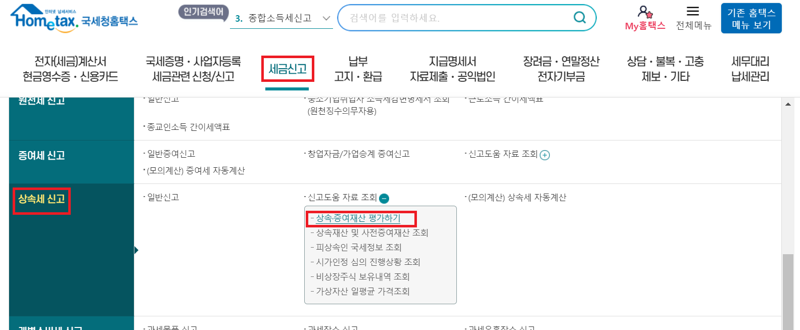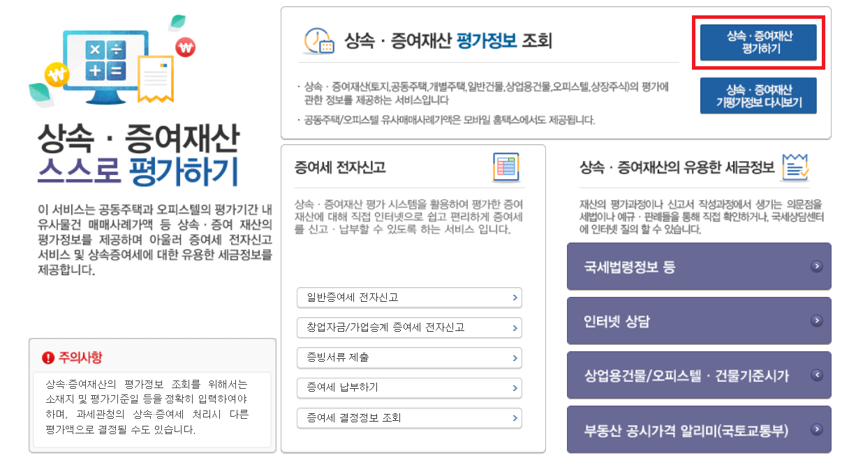 국세청 홈택스 접속 > 세금신고 메뉴 > 상속세 신고 > 신고도움 자료 조회 > 상속/증여재산 평가하기 클릭