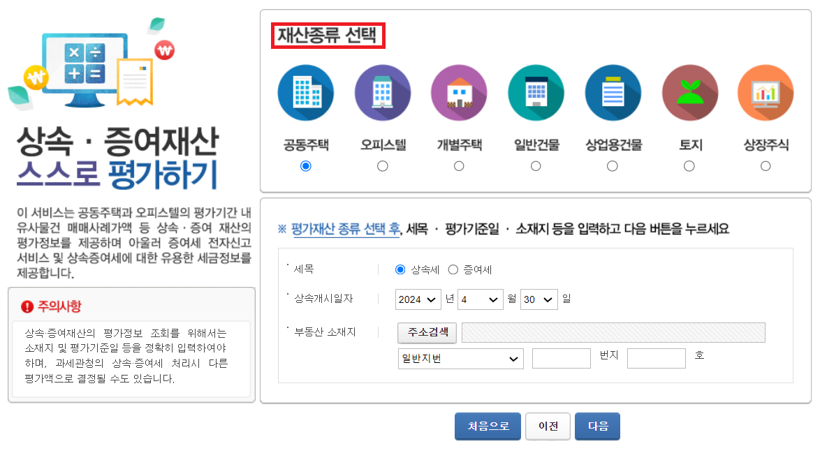'상속/증여재산 평가정보 조회'서비스에서는 상속/증여재산(토지, 공동주택, 개별주택, 일반건물, 상업용건물, 오피스텔, 상장주식)의 평가에 관한 정보를 제공하는 서비스입니다. 상속/증여재산의 정보를 입력하여 확인할 수 있습니다.