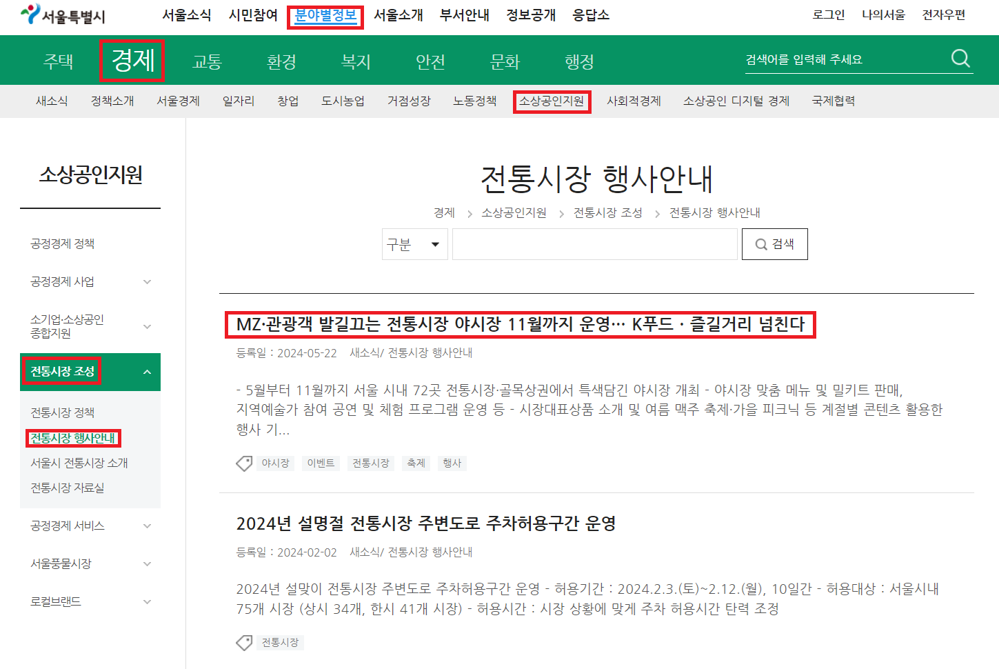 서울시 누리집 접속 > 메뉴 분야별정보 > 경제 > 소상공인지원 > 전통시장 행사안내