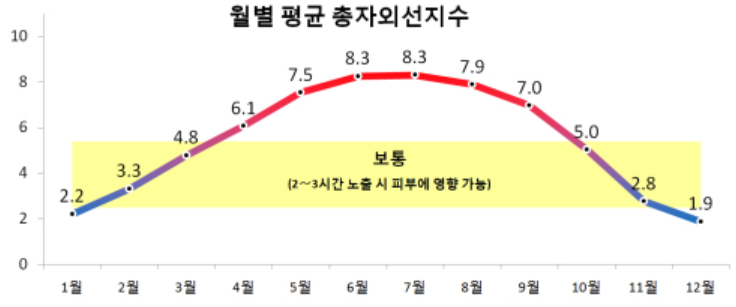 자외선지수는 4월부터 9월까지가 높기 때문에 자외선에 주의해야 합니다.