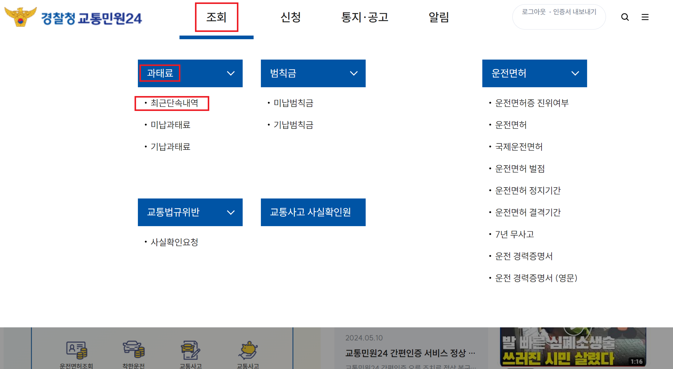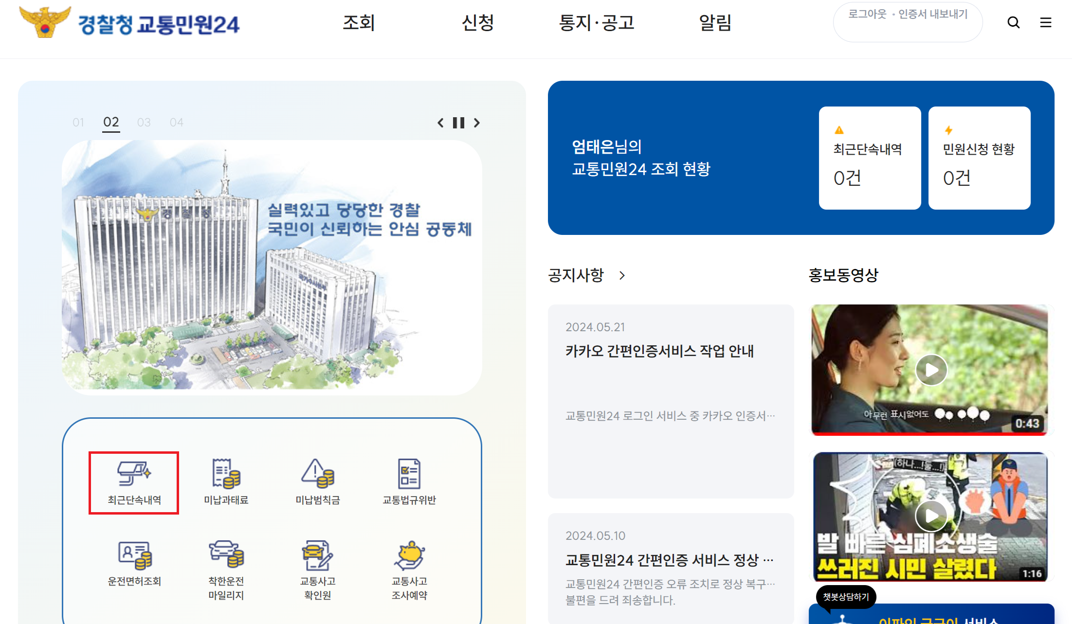 경찰청 교통민원24 홈페이지 접속 > 최근단속내역 클릭