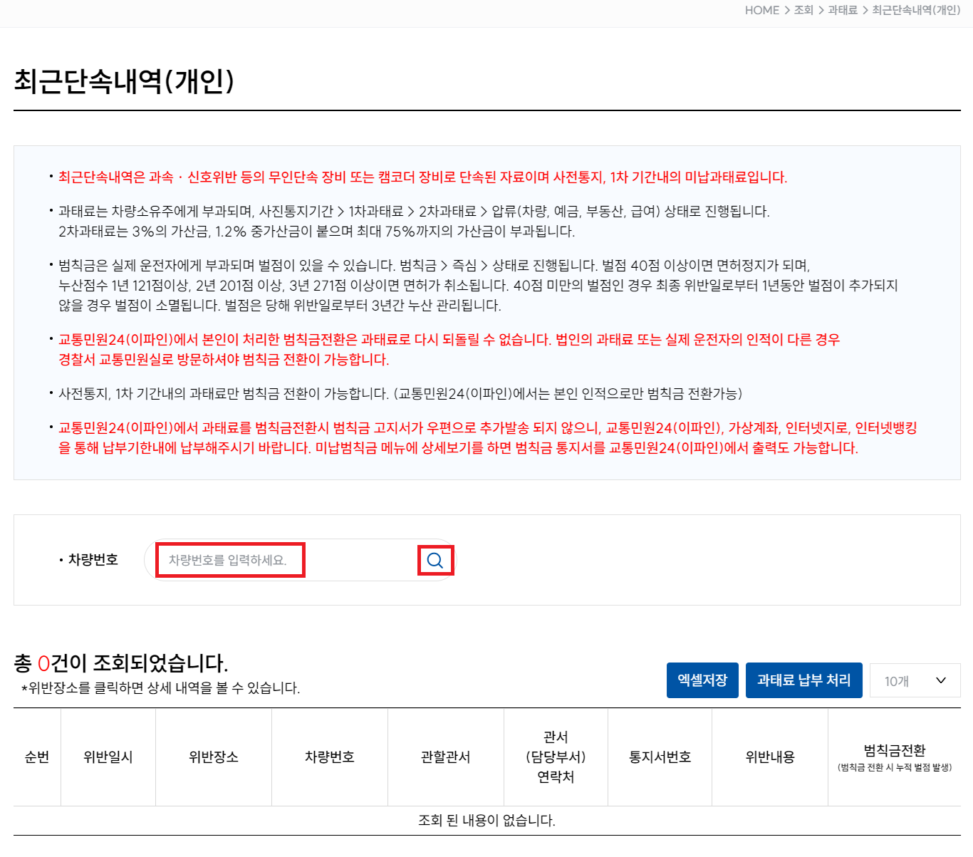 최근단속내역(개인) 페이지에서 차량번호 기입하는 란에 10가1234가 차량번호라면 뒤에 4자리 '1234'만 입력하고 돋보기그림을 누르면 됩니다.