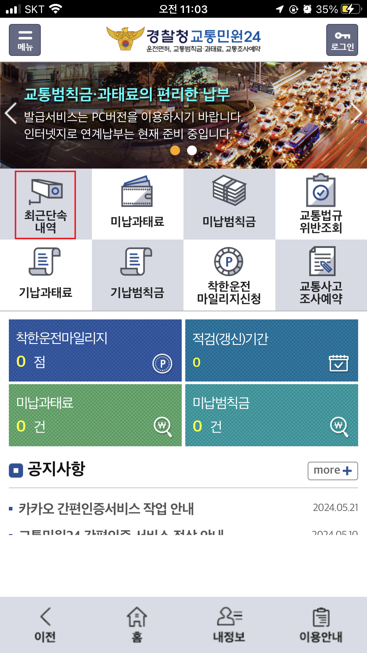 어플을 설치하고 접속하면 위와 같은 화면이 뜨는데 '최근단속내역'을 클릭하여 인증서 로그인을 한후에 실시간으로 속도위반 조회가 가능합니다.