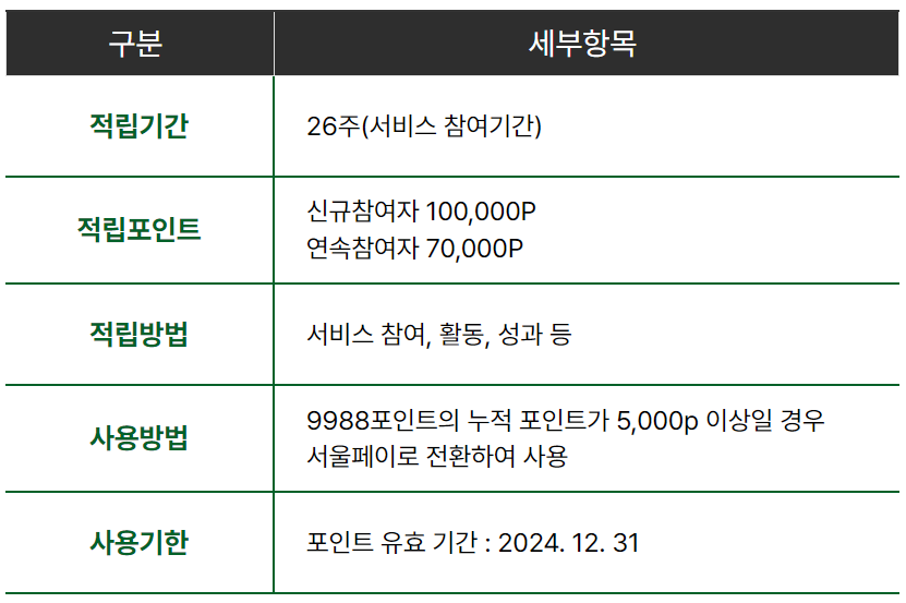 적립기간은 26주이며 포인트를 적립후 누적 포인트가 5,000포인트 이상일 경우 서울페이로 전환하여 사용할 수 있습니다. 포인트의 유효기간이 있으므로 24.12.31까지는 포인트를 사용하시기 바랍니다.