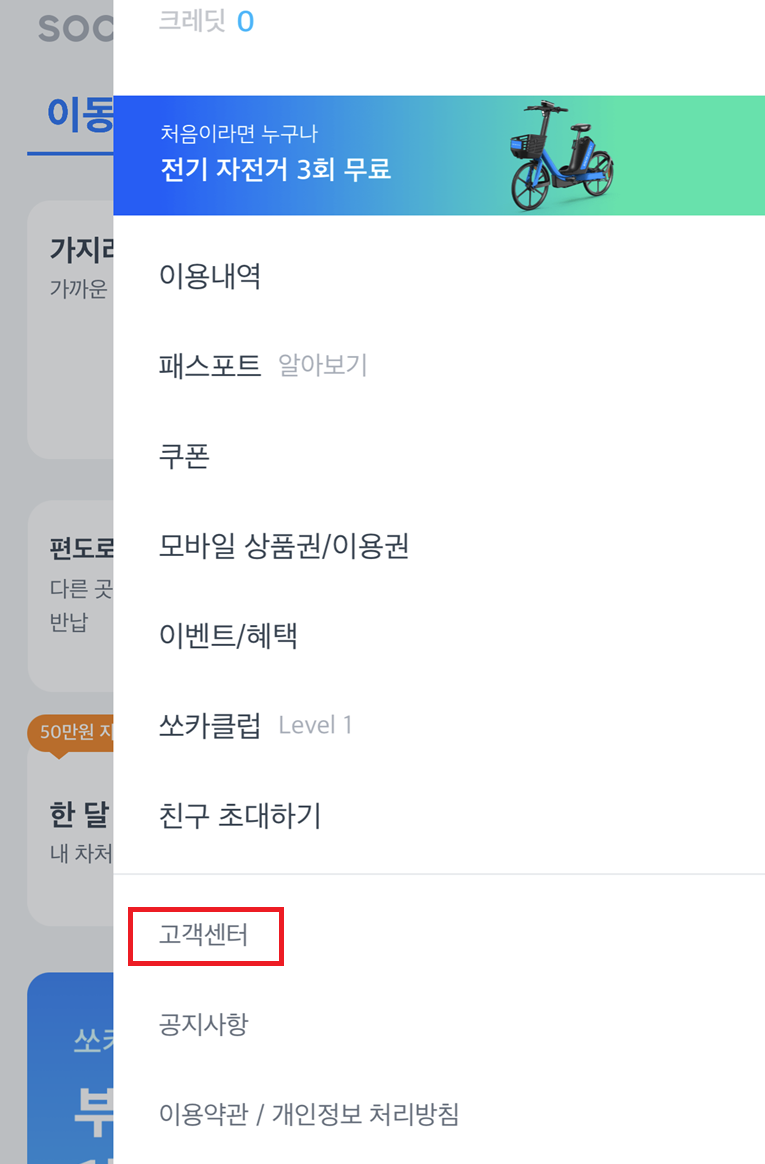 쏘카 앱을 실행했을 때 삼지창(三)을 클릭해 메뉴를 확인합니다. 고객센터를 눌러 이용안내, 사고 대처 및 보험 적용 안내, 예약관련, 반납관련 등에 대해 확인할 수 있습니다.