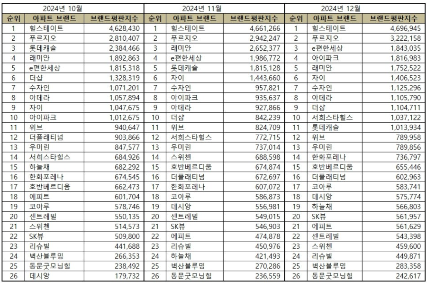 한국기업평판연구소 자료에 따르면 2024년 12월 기준으로 힐스테이트, 푸르지오, 이편한세상, 아이파크, 래미안, 자이, 수자인 순입니다.
