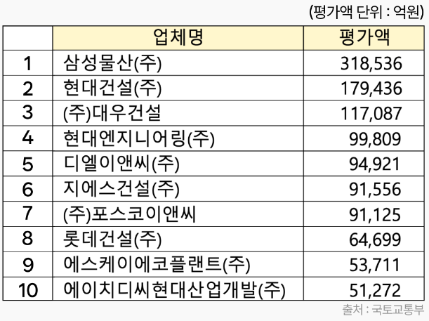 국토교통부에서 2024년 기준 한국 건설사 시공능력평가 순위를 공개했습니다. 삼성물산, 현대건설, 대우건설 순입니다.
