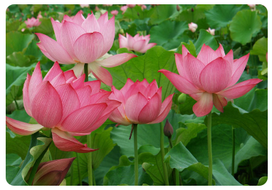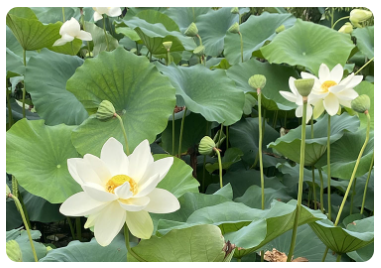 - 연꽃의 잎이 물위에 뜬 잎과 물 위로 높이 올라와 있는 서있는 잎(입엽)으로 이뤄져 있음, 잎과 꽃이 수면 위로 올라와 공중에 떠 있는 모습