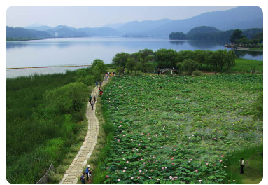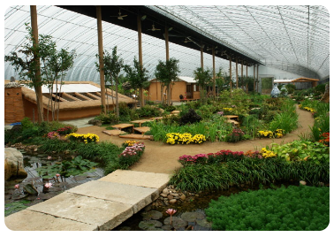 | 연꽃이라는 단일테마로 연꽃 관련 생활용품, 음식, 옛 문서 등 유물들을 모아 전시합니다. | 사람과 자연이 둘이 아니고 하나라는 우리 민족의 태극기 속에 내재된 자연 철학사상을 담았습니다. | 한반도 모양의 연못에 백수련을 심고 소나무와 무궁화를 둘러 심어 나라 사랑의 마음을 키우고자 합니다. | 맑고 아름답고 풍요로운 한강과 나라와 가정의 안녕을 기원하는 분수입니다. | 세계적인 연꽃 연구가 페리슬로컴 박사의 가족이 직접 와서 심어주신 다양한 연꽃이 피는 연못입니다. | 청아한 흰 연꽃이 피는 연못으로 연꽃의 청정함을 가장 잘 보여줍니다. |